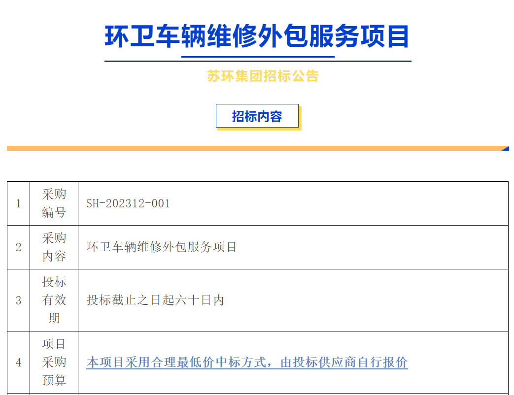 “蘇環集團招標公告:環衛車輛維修外包服務項目公開招標”